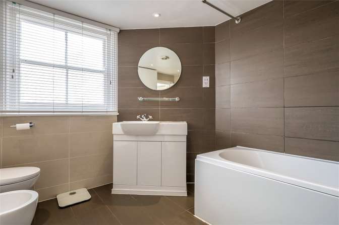 On the second floor facing south is the master bedroom. There are extensive built-in wardrobes along one wall and two more built in to the alcoves either side of the chimney breast. The bathroom is also on this level with smart white bathroom suite and stylish brown and beige tiling. The washing machine is also housed here, discreetly stored in a specially built cupboard.