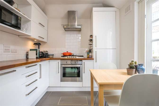 On the half landing to the rear is the beautifully appointed kitchen with wooden work surfaces and white kitchen units. There is a well-sized terrace directly accessed via quaint patio doors with space for a table and chairs and pot plants.