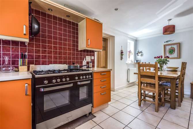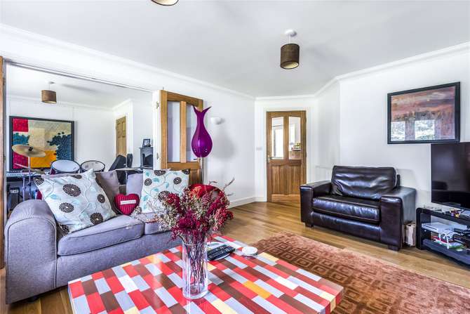 On entering the house there is a large hallway with oak flooring leading to a good sized study/bedroom, which overlooks an attractive lawn with a pretty magnolia tree. The ground floor comprises of a large living room and dining room L-shaped with a marvellous marble fire place and French doors leading onto the garden, perfect for warm summer days. The dining room is accessed through double hardwood glass doors and is a great entertaining space. All doors are solid hardwood with brass handles: a real sense of quality can be seen in this house with such finishing touches. The ground floor also contains a utility, shower room and an internal access point to the garage from the utility, which is currently being used a gym. The kitchen adjoins the dining area and also incorporates a good-sized eating space for around 6-8 people.
