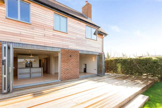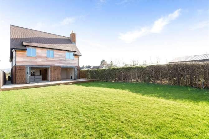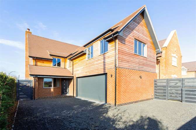 a striking detached modern home of timber frame construction with mellow brick elevations featuring larch cladding under pitched tiled roofs.