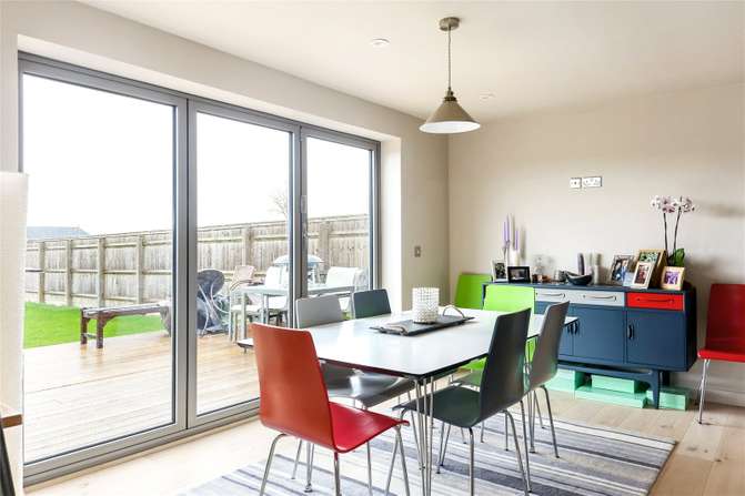 The kitchen & family room has sliding double doors through to the sitting room which features a wood burning stove. Both rooms enjoy sliding bi-fold doors leading to a large timber decked terrace.