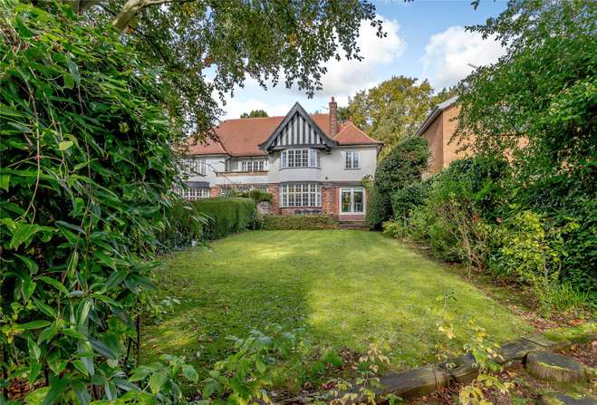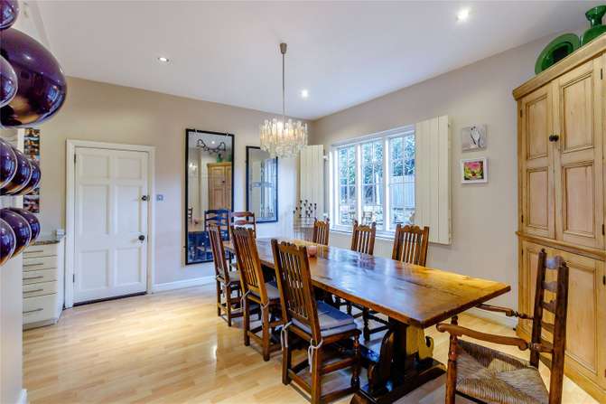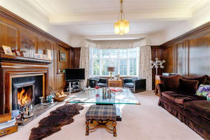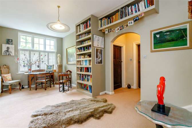 Stunning internal reception hallway with fitted cabinets and bookshelves and a deep built-in storage room. Drawing room set within the original house with lovely high detailed ceilings, three quarter oak panelled walls with carved detailing. Period inset oak carved chimneypiece with an open fire and an ornate back with a marbled hearth, wide bay window.